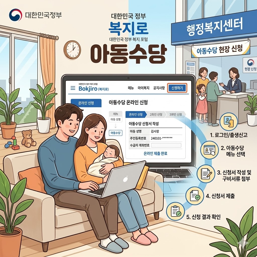 신청 과정은 보통 본인 확인, 아동 정보 확인, 지급 계좌 입력, 필요 서류 제출 순서로 진행됩니다. 온라인 신청이 가능한 경우에는 인증서나 간편인증이 필요할 수 있습니다.